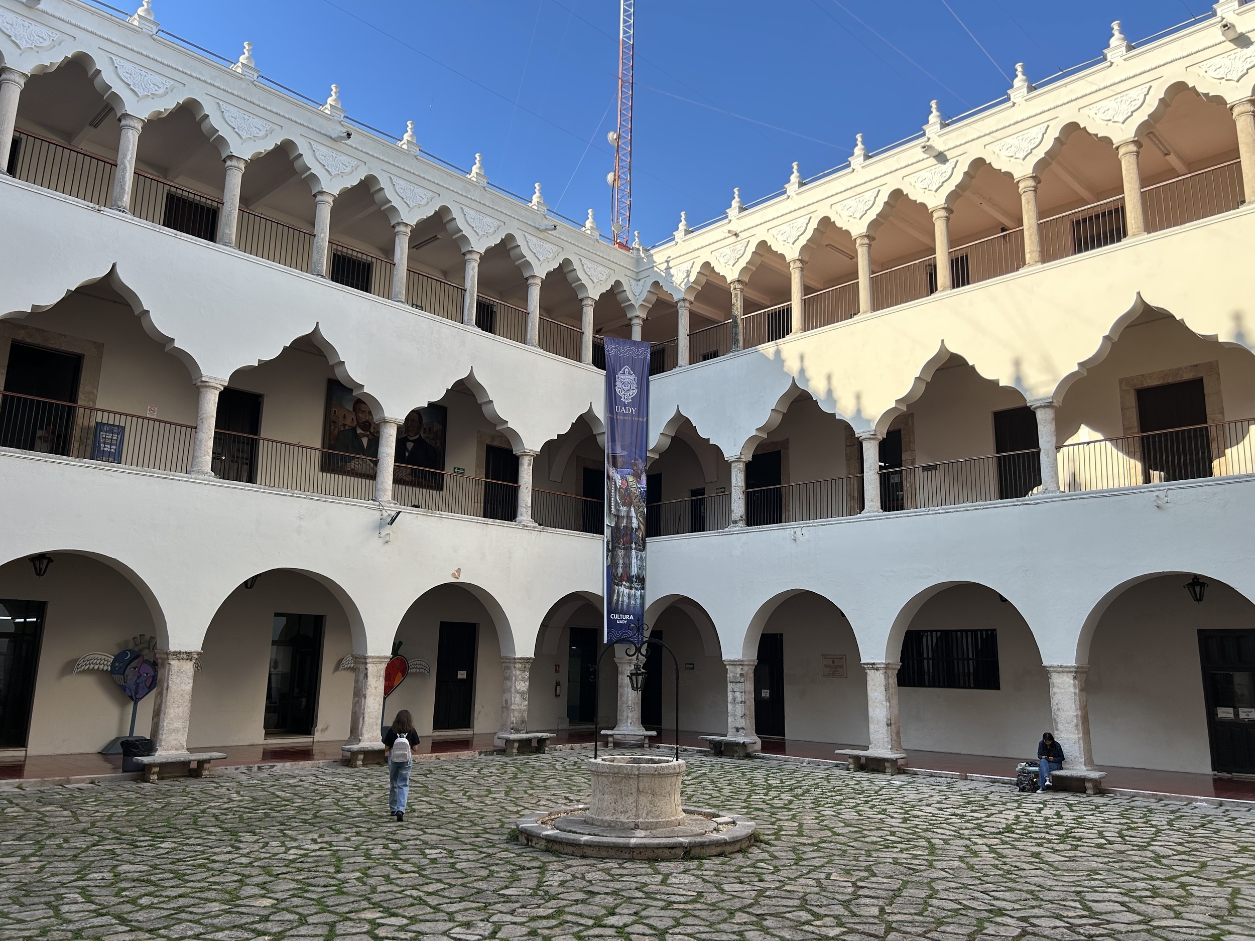 Widoczny na zdjęciach czworoboczny dziedziniec uniwersytecki z kamienną posadzką i studnią pośrodku zachowuje klasyczny układ kolonialny typu claustro. Dwukondygnacyjne krużganki z arkadami wspartymi na smukłych kolumnach oraz dekoracyjne, falujące zwieńczenia attyk (typowe dla architektury jukatańskiej) łączą tradycję hiszpańską z lokalnym rzemiosłem kamieniarskim.