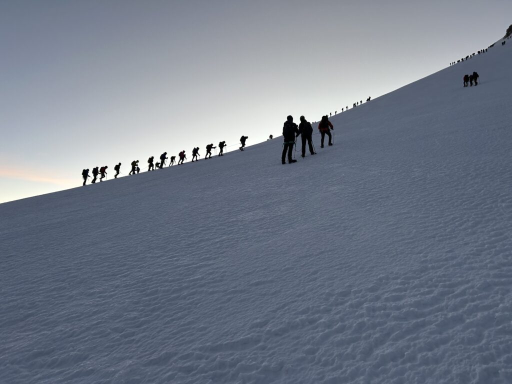 Świt i wczesny poranek to optymalna pora na pokonywanie lodowca. A także na kontemplację, mimo wszelakich niedogodności. Zejście musi nastąpić zanim śnieg i lód zmiękną, bądź chmury „siądą” na masywie.
