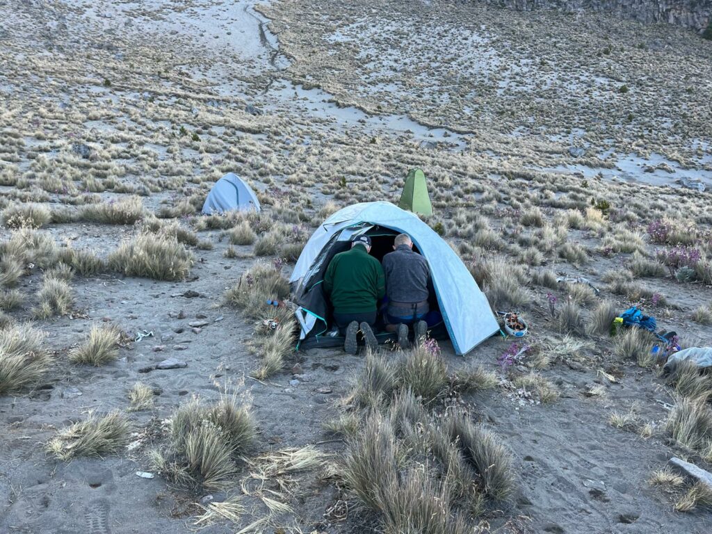 Wysoko położone pole namiotowe Piedra Grande (4250 m) pełni rolę Base Campu. Nazywanie jej „hut” albo „refugio” jest odrobinę na wyrost. Luksus, przynajmniej namioty nie są jeden na drugim.
