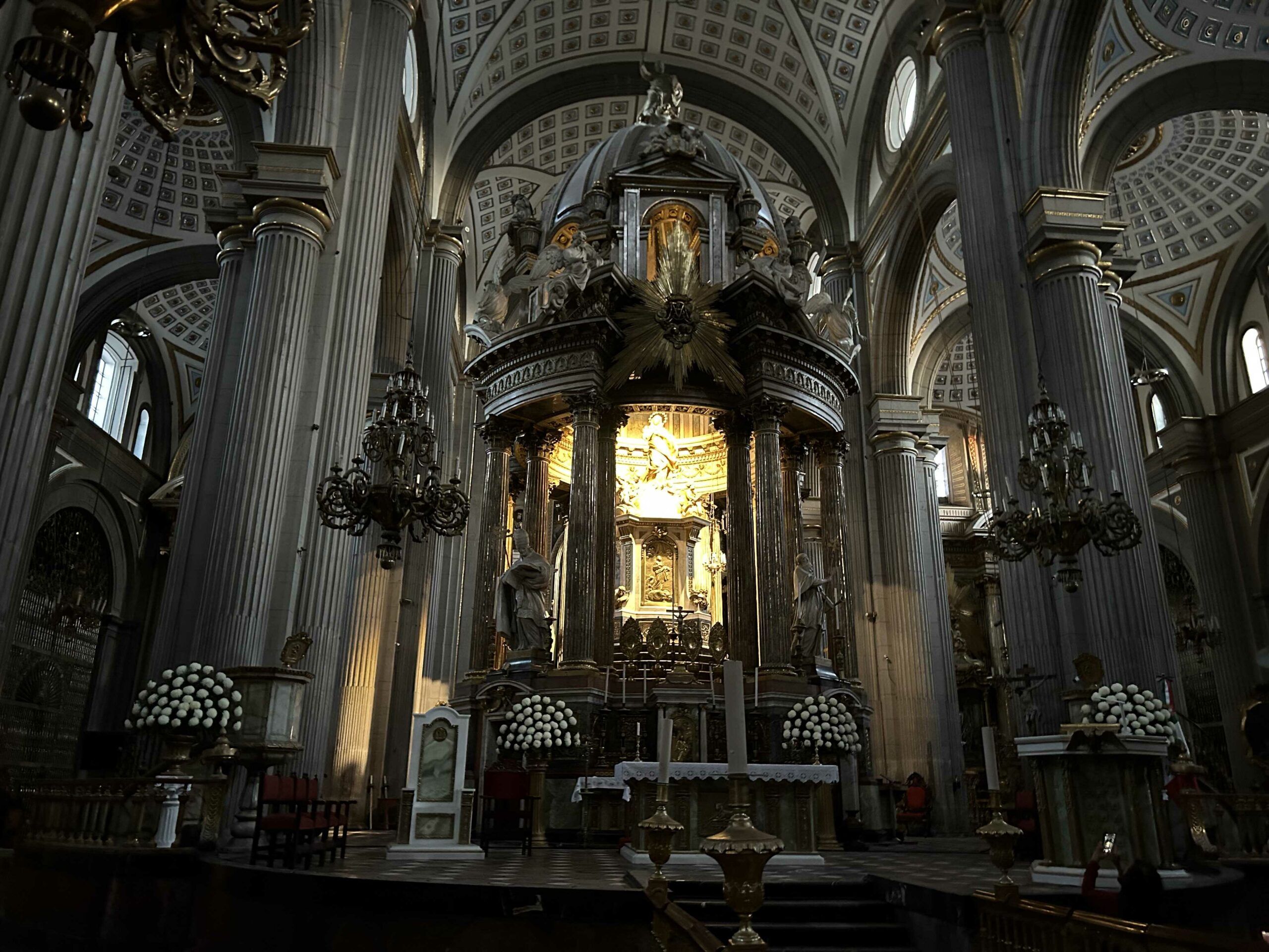 Centralnym elementem wnętrza jest cyborium nad ołtarzem głównym, zaprojektowane pod koniec XVIII wieku przez Manuela Tolsá. Zamiast tradycyjnego, przylegającego do ściany retabulum, zdecydowano się na wolnostojącą formę, inspirowaną architekturą rzymską.