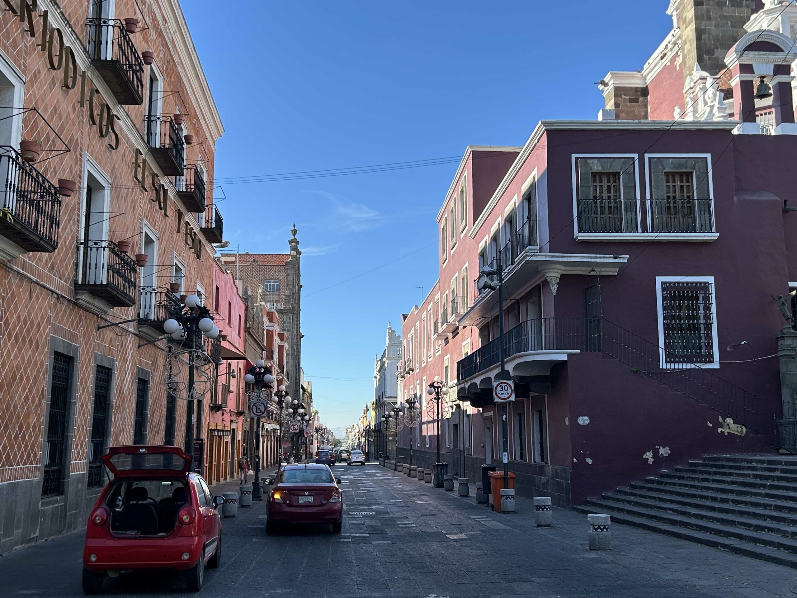 Puebla została zaprojektowana według klasycznego kolonialnego schematu szachownicy, z prostymi ulicami przecinającymi się pod kątem prostym. Układ ten oparto na zasadach „Leyes de Indias”, regulujących zakładanie miast w hiszpańskich koloniach, co sprzyjało kontroli przestrzeni, czytelności miasta i orientacji w nim. Podobnie jak w Meridzie, siatkę ulic zrealizowano wyjątkowo konsekwentnie, porządek urbanistyczny nadaje centrum spokojny, niemal rytmiczny charakter.