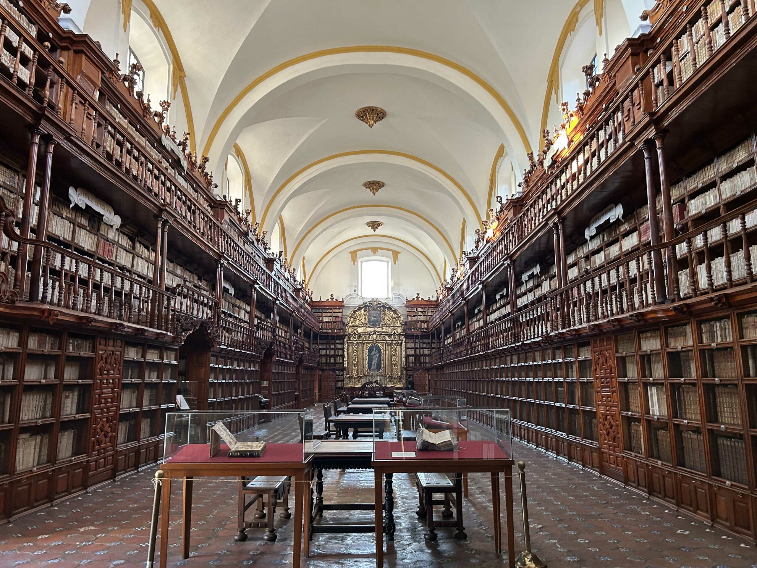 Biblioteca Palafoxiana założona w 1646 r. przez biskupa Juan de Palafox y Mendoza jako pierwsza publiczna biblioteka w obu Amerykach. Fundator przekazał własny księgozbiór (ok. 5 tys. woluminów), zastrzegając, że będzie on dostępny dla wszystkich. Był to gest wyjątkowy w realiach XVII-wiecznej Nowej Hiszpanii, gdzie wiedza pozostawała zazwyczaj domeną zakonów i wąskich elit. Zbiory obejmują dzieła z zakresu teologii, prawa, filozofii, nauk ścisłych i humanistyki, w tym liczne druki europejskie z XVI i XVII wieku. Biblioteka mieści się w pierwotnej sali z XVIII-wiecznymi drewnianymi regałami, które stanowią unikatowy zabytek kultury materialnej epoki.