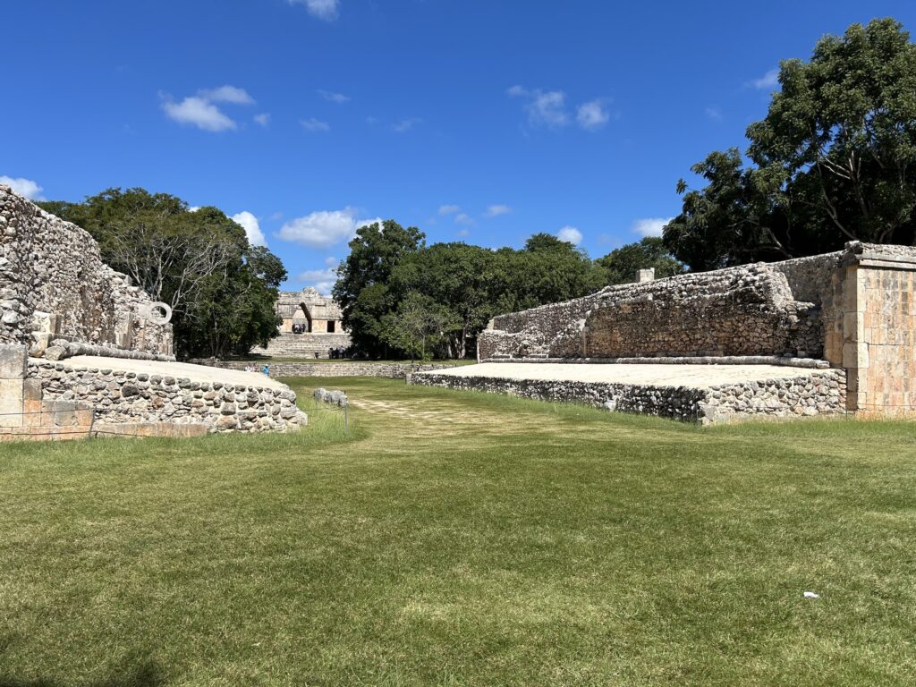 Boisko do gry w piłkę (pok-ta-pok) jest niewielkie i pozbawione dekoracji, co wskazuje, że gra miała tu charakter ograniczony do wąskiego kręgu uczestników. Skromna forma boiska wpisuje się w charakter całego miasta, gdzie akcent położono na kontrolowaną ceremonialność, a nie na spektakularność rytuałów. W przeciwieństwie do monumentalnych boisk znanych z Chichén Itzá, obiekt w Uxmal nie pełnił funkcji masowego widowiska ani narzędzia demonstracji władzy.