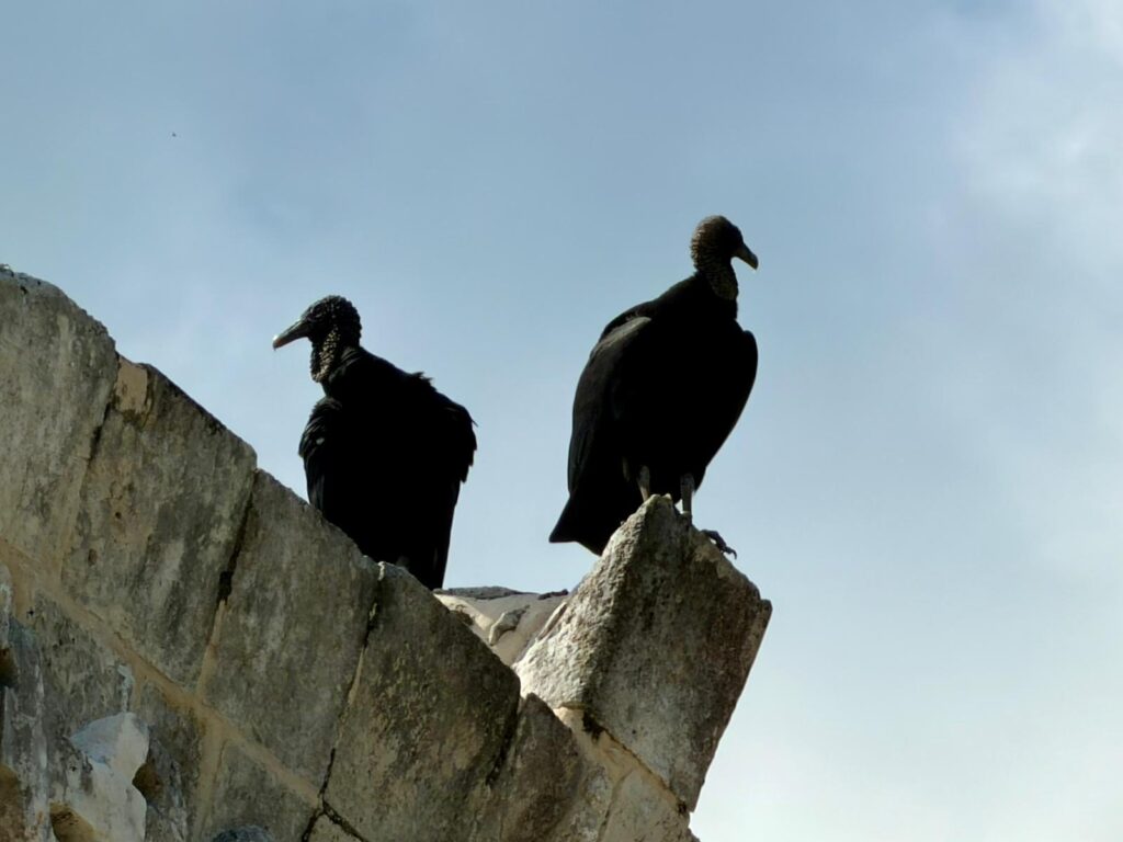 Na kamiennych murach Uxmal często przysiadają sępy. Czarne sylwetki ptaków kontrastujące z jasnym wapieniem potęgują wrażenie ciszy i opuszczenia, wzmacniając refleksję nad przemijaniem potęgi dawnych cywilizacji.