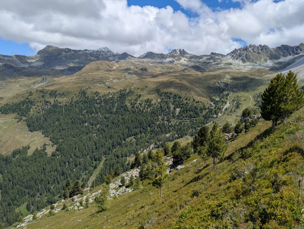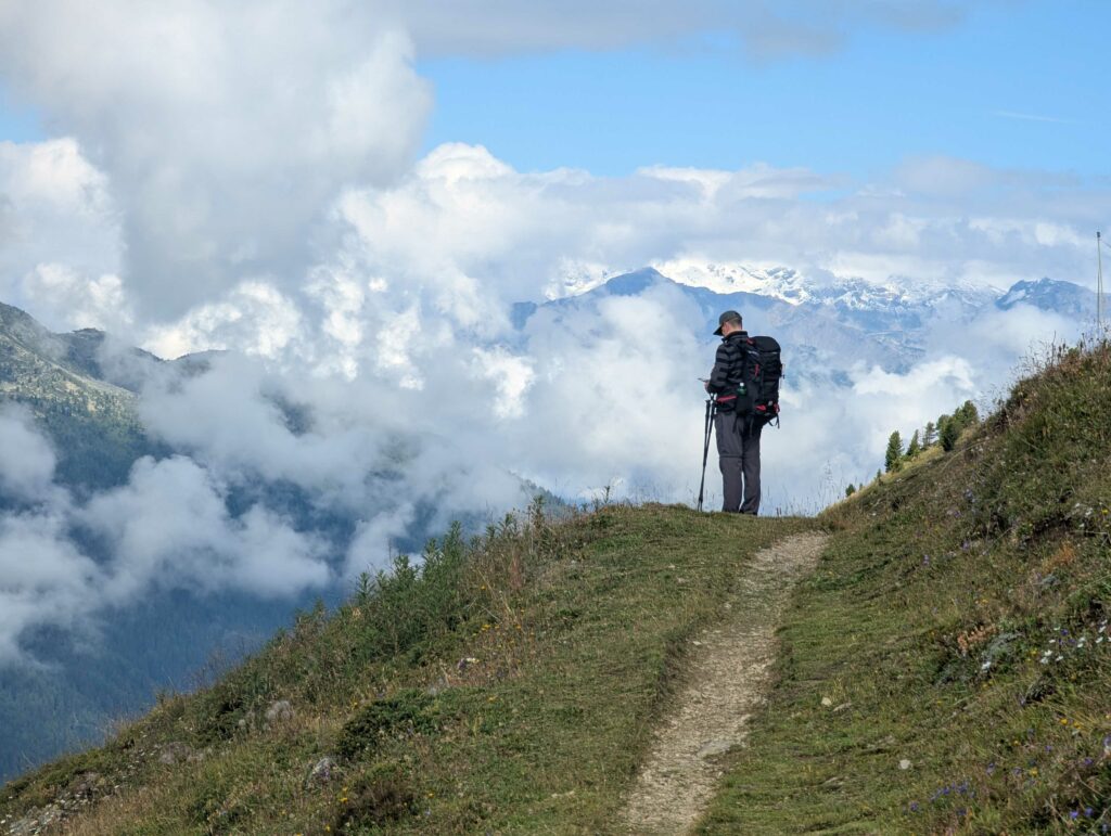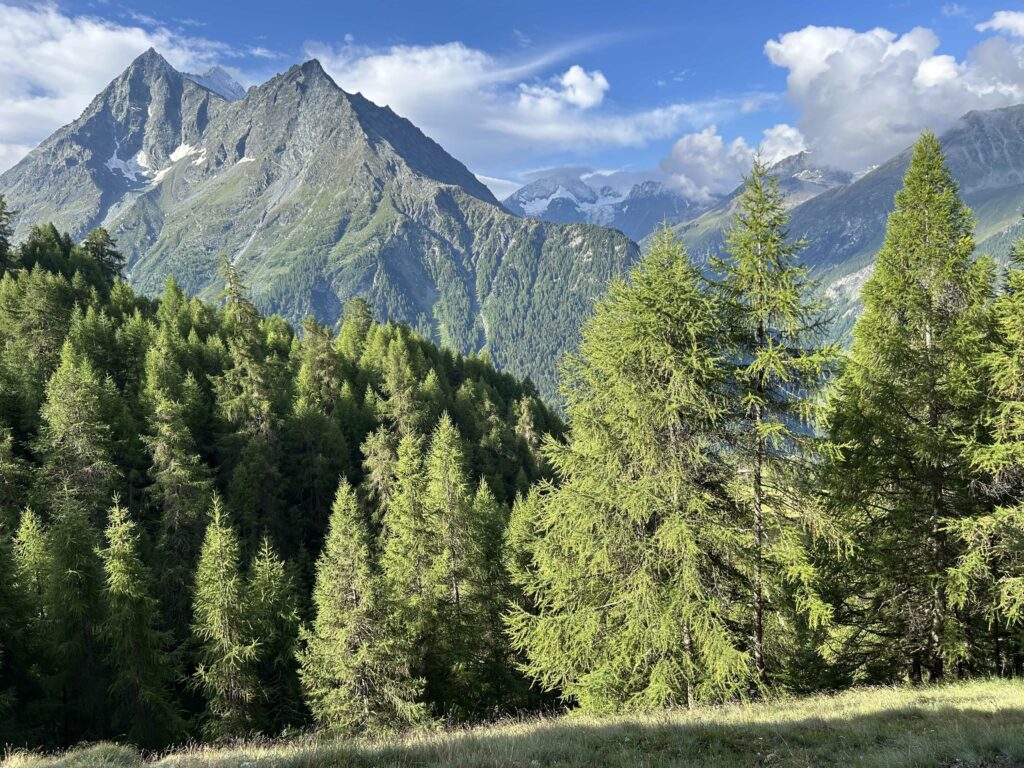 Szlak biegnie wysoko, niemal poziomo, jakby zawieszony między ziemią a niebem. To tzw. trasa balkonowa – jedna z najpiękniejszych dróg panoramicznych w Alpach Walijskich. Wędrowiec idzie tu nie po to, by zdobywać wysokość, lecz by chłonąć przestrzeń: szerokie doliny, rozległe hale, lasy modrzewiowe i dalekie, usłane chmurami grzbiety, które w słońcu wydają się miękkie jak aksamit. Czas zwalnia – droga ma w sobie spokój i ciszę, które trudno znaleźć w dolinach.
