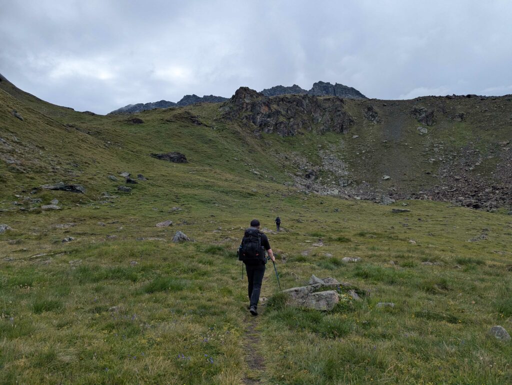 Ostatnie oddechy dnia mieszają się z odcieniami zieleni oraz cieniem skał. Etap trochę „na azymut” przez łąki, kruche piargi i jasne pasma łupków, na których widać ślady dawnych lodowców. Poszarpane grzbiety gór błyszczą w słońcu powoli zniżającym się ku zachodowi.