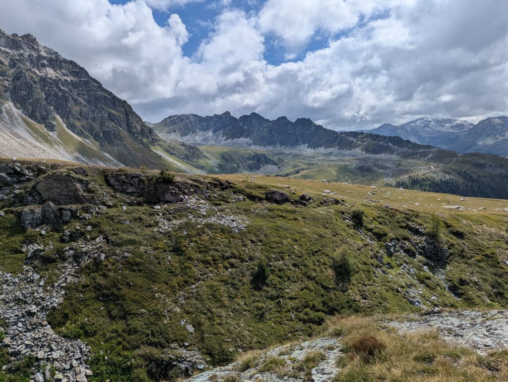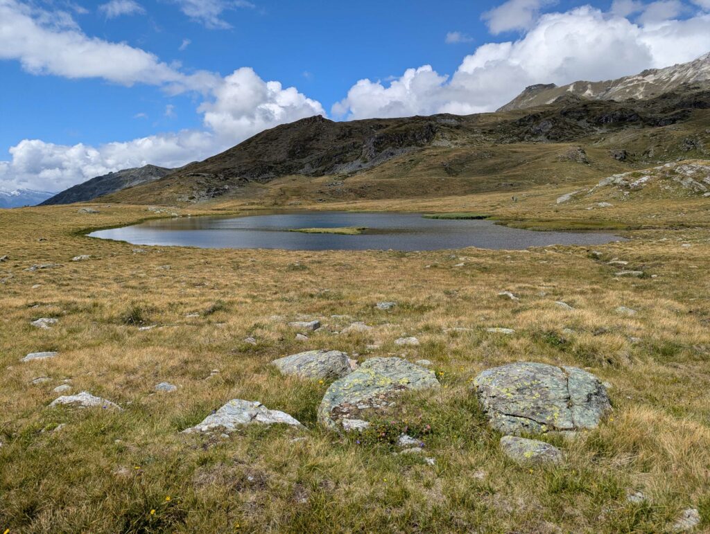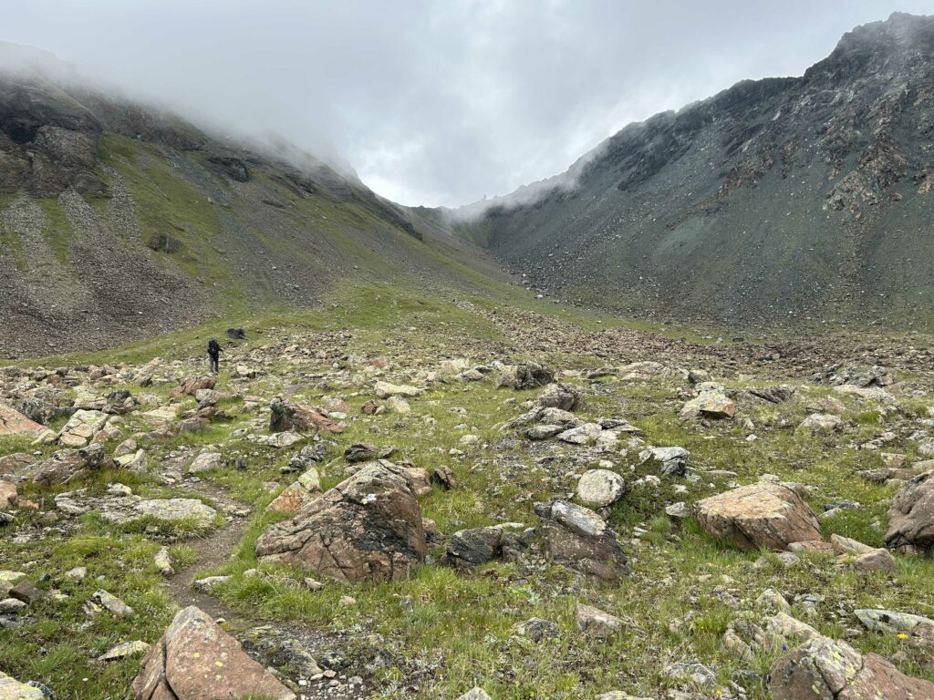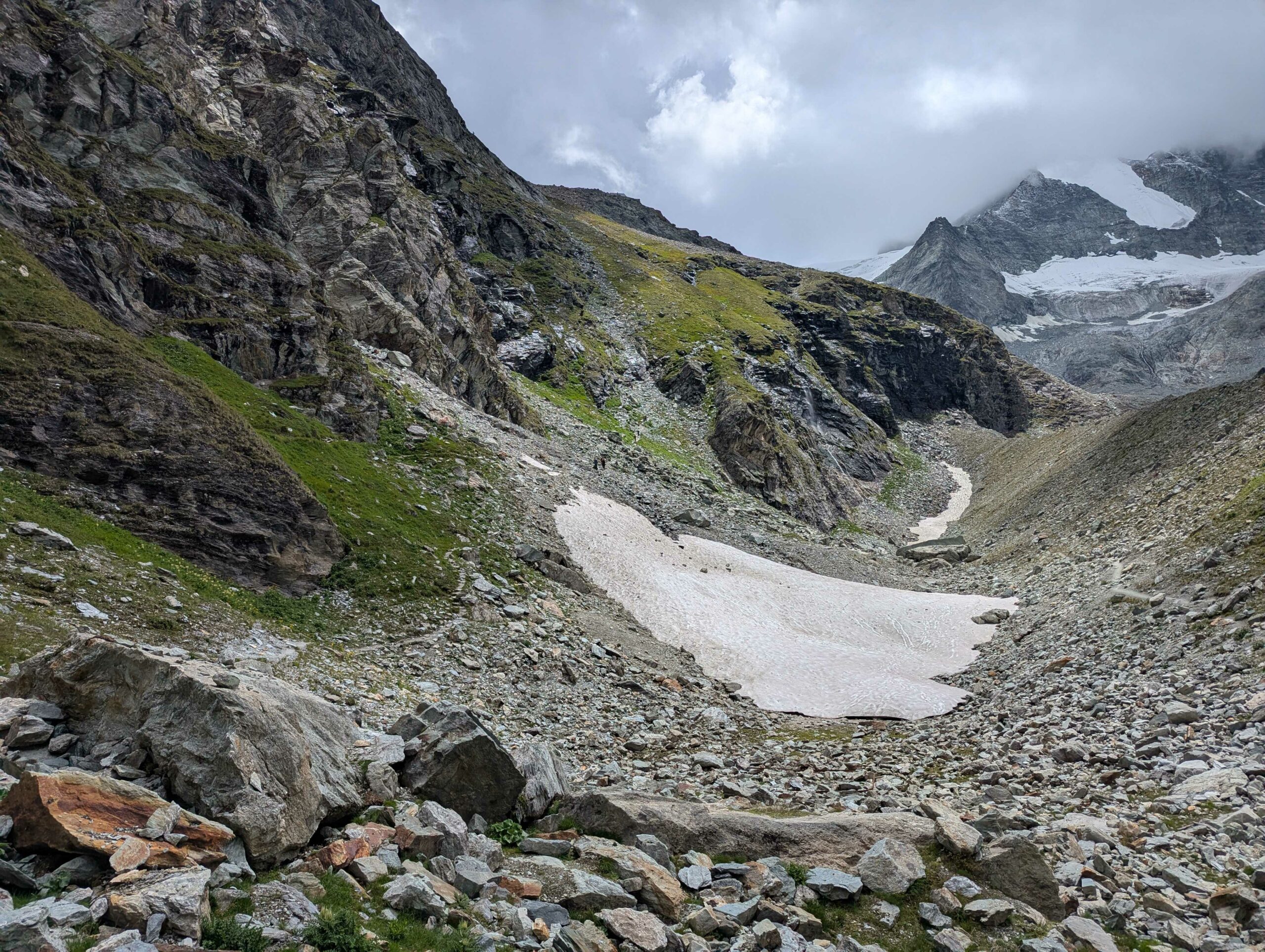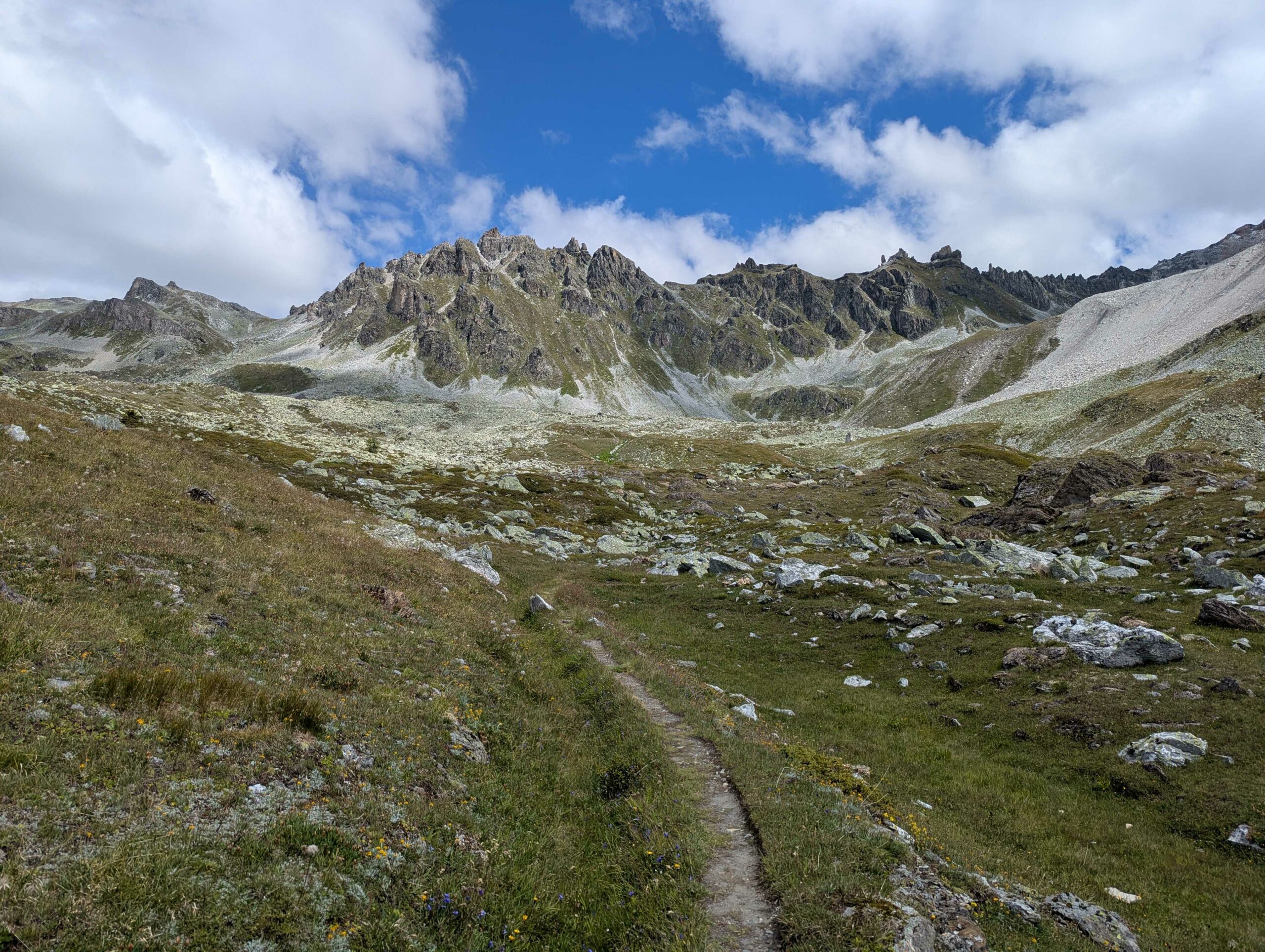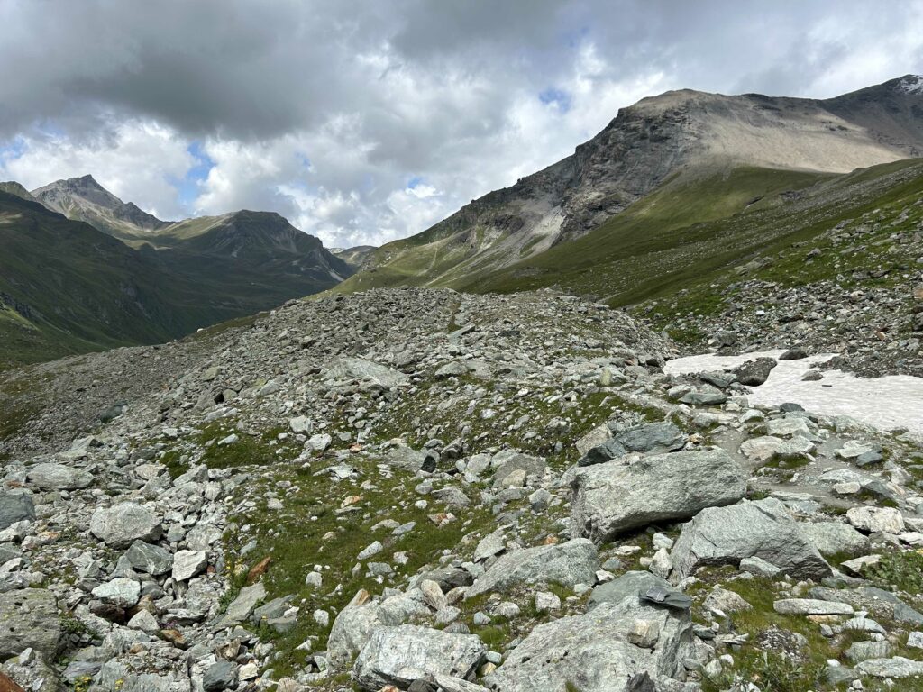 Ścieżka wznosi się przez trawiastą nieckę, lawirując wśród porozrzucanych głazów o brązowym i zielonkawym połysku – łupków chlorytowych i serpentynitów, typowych dla tej części Alp Pennińskich. Ich barwa, zmieniająca się od szarości po głęboką zieleń, jest pozostałością po dawnych procesach metamorficznych, gdy dno pradawnego oceanu Tetyda zostało wypchnięte ku górze w czasie fałdowania alpejskiego.