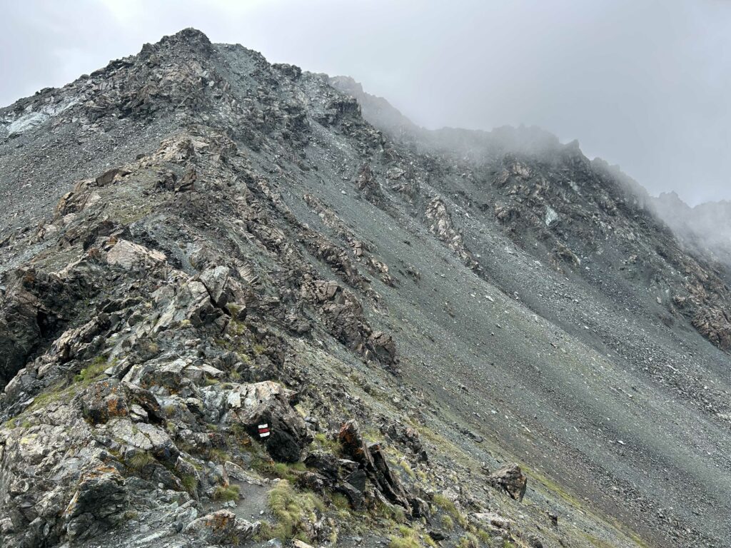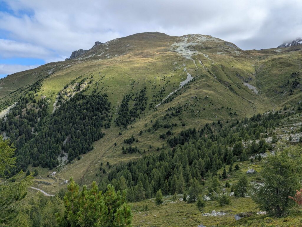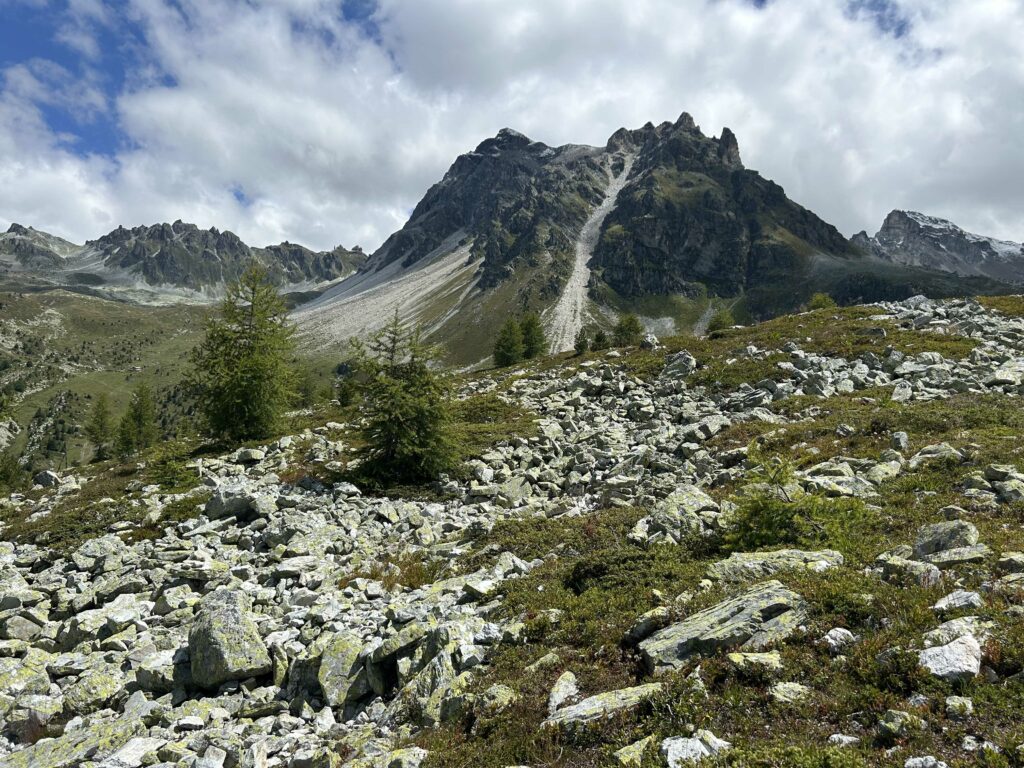 Przed nami wyrasta charakterystyczna piramida Le Touno (3018 m) z postrzępioną granią, dominując nad środkową częścią Val d’Anniviers. Południowo-zachodnia ściana prezentuje ciemne gnejsy i łupki pennińskie porozcinane żlebami, z których schodzą jasne języki piargów. Pojedyncze modrzewie i łany kosówki podkreślają skalną surowość góry określanej w lokalnych opisach jako „balkon nad doliną” (zdobyta w 1901 r.).