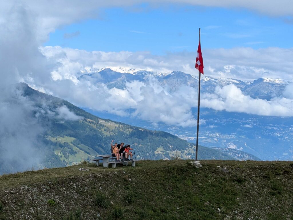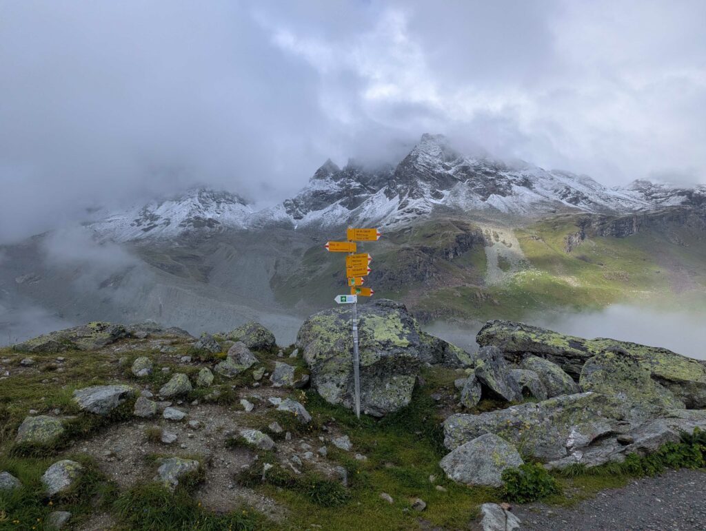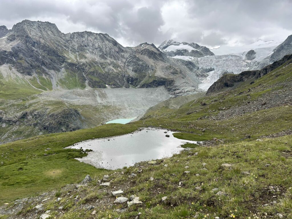 Cabane de Bella Tola (2346 m) — kolejna oaza na otwartym, trawiasto-skalnym tarasie wysoko nad doliną Anniviers. Choć odnowione w 2021 roku i nowoczesne w formie, schronisko zachowuje ducha dawnych alpejskich chat — prostotę, funkcjonalność i gościnność, które od zawsze stanowiły o ich sile. Z tarasu można dojrzeć Weisshorn (4506 m) i Bishorn (4153 m) — odległe czterotysięczniki zamykające północny horyzont doliny. W oddali majaczą także zarysy Alp Berneńskich, tworząc delikatne tło dla jednej z najpiękniejszych panoram Val d’Anniviers.