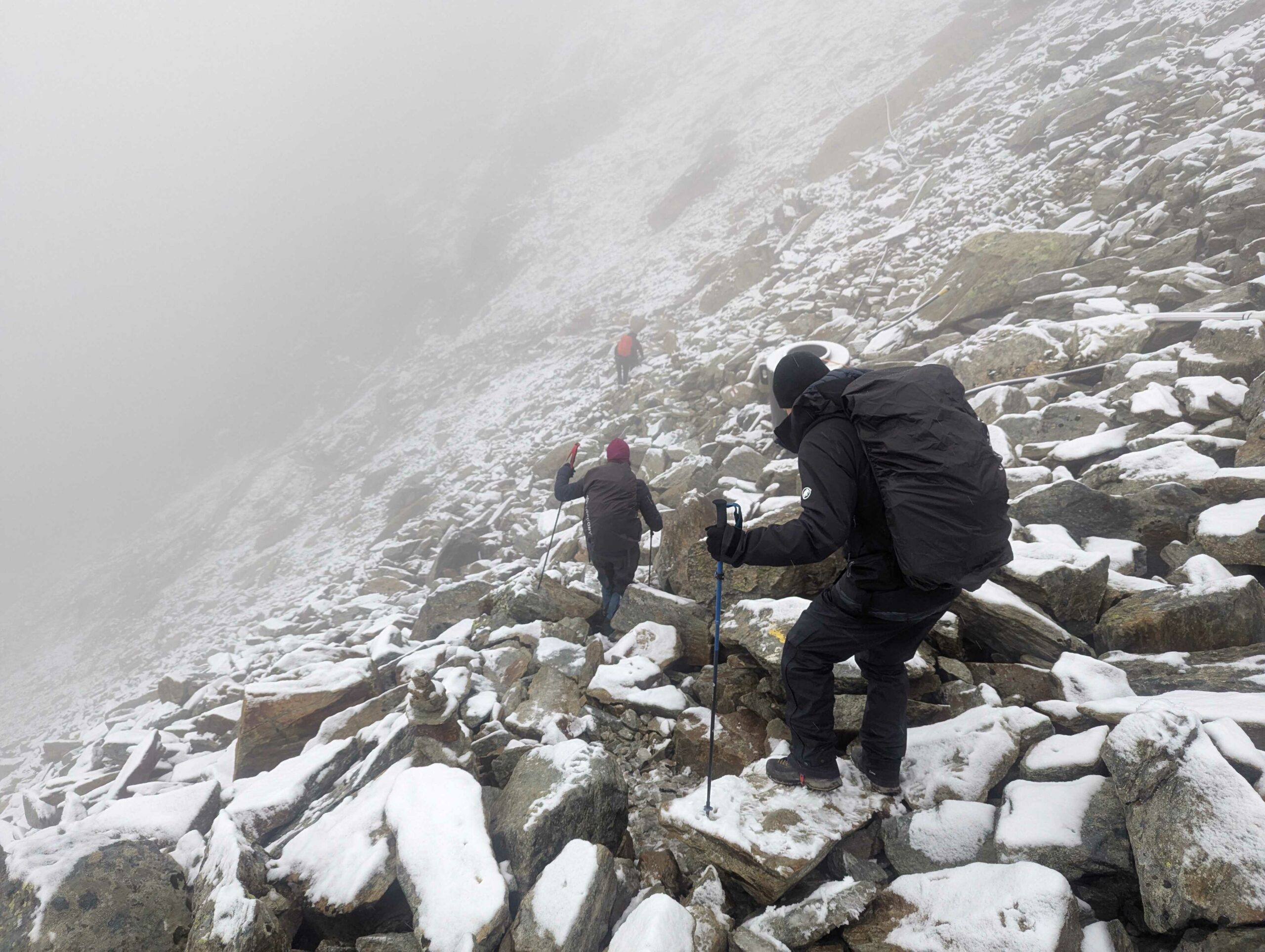Wieczorem podnóże lodowca pachniało latem i rozgrzanym kamieniem. Rankiem aura pokazała inne oblicze — szlak przykryty świeżym śniegiem, skały oprószone śliskim pudrem, a oddech paruje w lodowatym powietrzu. Krok po kroku, we mgle i skrzypiącym śniegu, wędrowiec musi się zmierzyć z białą krainą.
