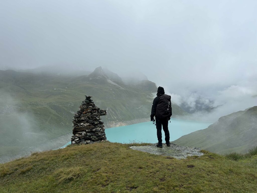 Naturalny balkon z widokiem na Lac de Moiry (2249 m) – turkusowa tafla jeziora w porannym, zamglonym świetle i siąpiącym deszczu wygląda jak rozlana farba na płótnie gór. W Alpach Walijskich „cairny” (dawniej zwane też montjoies) budowali pasterze i przewodnicy, by prowadzić wędrowców przez mgłę czy niespodziewany śnieg.