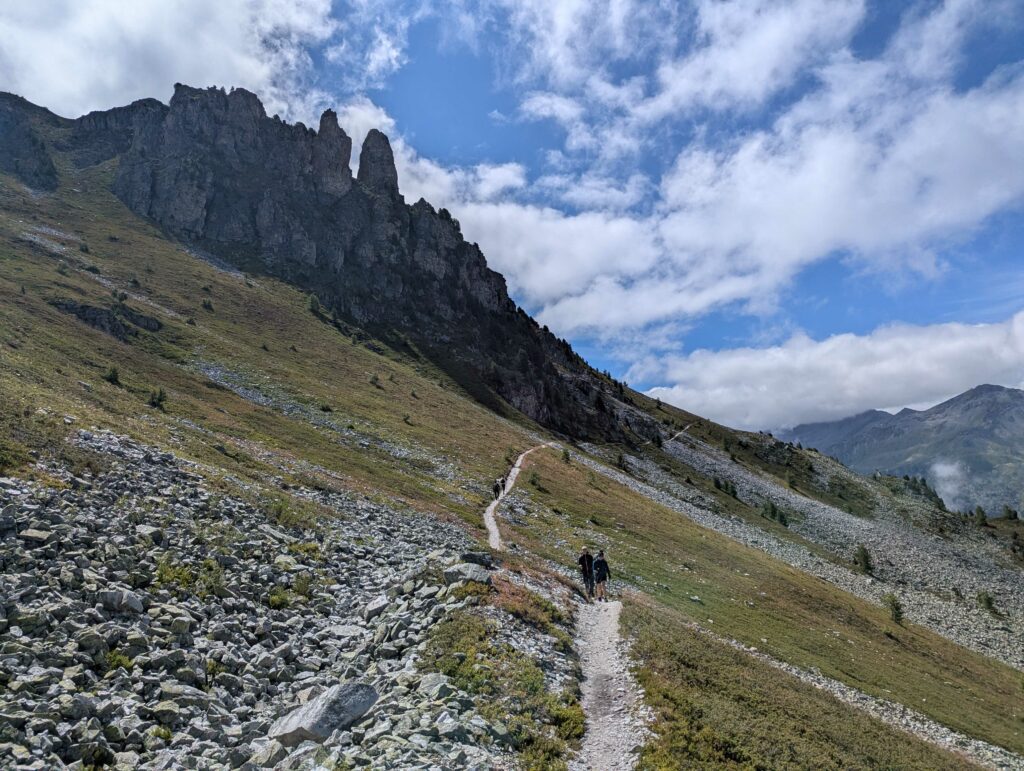 Ścieżka wznosi się wśród zagajników i łąk, z których otwiera się widok na skalne iglice zamykające dolinę. Wędrowcom towarzyszy strzelista, czworokątna sylwetka Dent de Perroc (3676 m), a tuż obok — niższa, ale równie poszarpana Dent de Vésivis (3418 m). Oba szczyty zbudowane są z ciemnych łupków i wapieni, które w świetle poranka mobilizują do dalszej drogi.