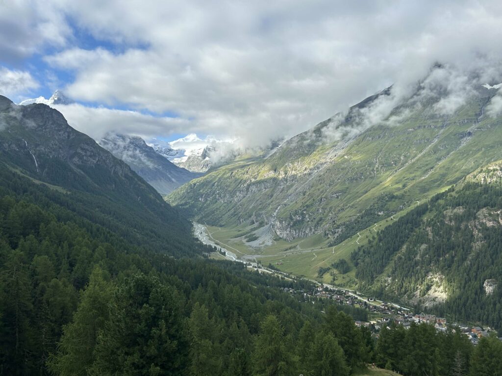 Otwiera się widok na górną część Doliny Rodanu (Val du Rhône), jedną z najważniejszych arterii Alp Szwajcarskich. Rodan, wypływający z lodowca pod przełęczą Furka (2436 m), przecina kanton Valais od wschodu ku zachodowi, aż po Jezioro Genewskie. Jego dolina stanowi naturalny korytarz między Alpami Berneńskimi a Pennińskimi, od stuleci będąc osią komunikacyjną i gospodarczą regionu.