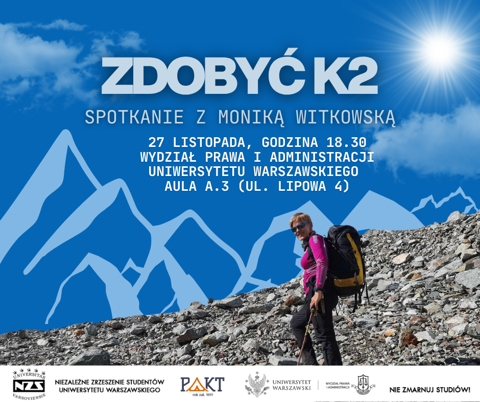 „Zdobyć K2” – spotkanie z Moniką Witkowską odbędzie się 27 listopada 2025 r. (czwartek) o godz. 18:30 w auli A.3 na Wydziale Prawa i Administracji Uniwersytetu Warszawskiego przy ul. Lipowej 4 (Collegium Iurudicum II). Wydarzenie organizowane wraz z Niezależnym Zrzeszeniem Studentów Uniwersytetu Warszawskiego (NZS) oraz Prawniczym Akademickim Klubem Turystycznym WPiA UW (PAKT). Wstęp wolny.